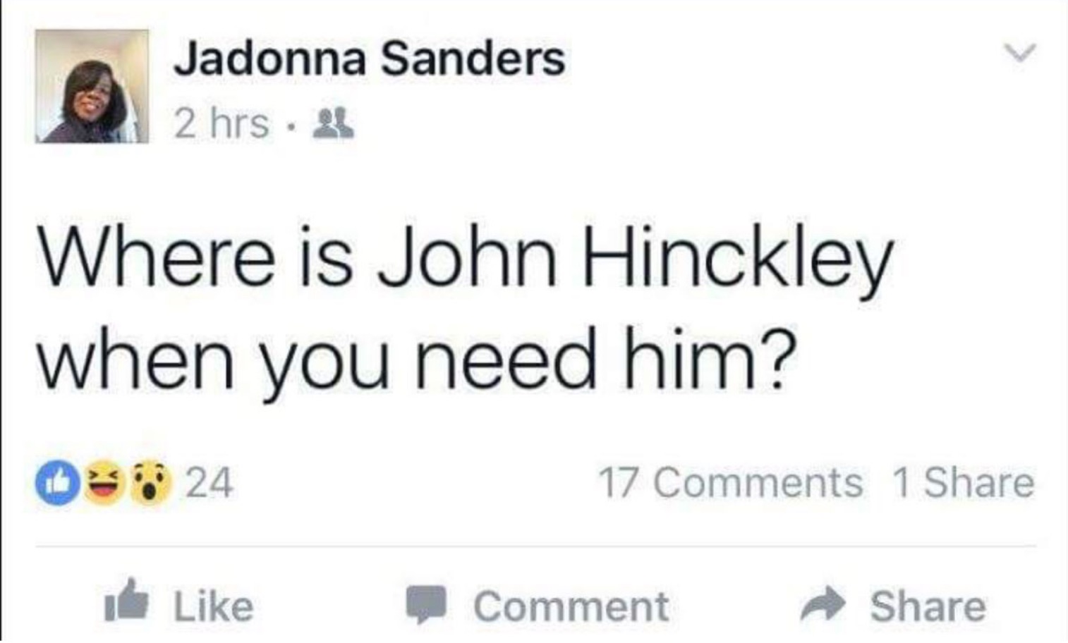 A DC fire inspector is under investigation for an anti-Trump post made on inauguration day that said “Where is John Hinckley when you need him?” The reference is to John Hinckley, the man who shot President Reagan in 1981.